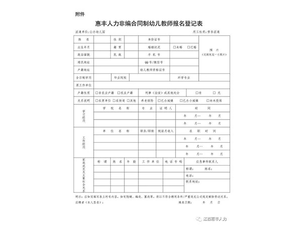 為滿足我市公辦幼兒園師資需求,我公司面向社會公開招聘一大批非事業(yè)編合同制幼兒教師,以勞務派遣的方式與用人單位進行勞動力資源開發(fā)合作。現(xiàn)將有關事項公告如下:一、招聘人數(shù)及崗位我市招聘非事業(yè)編合同制幼兒教師50名,具體崗位在選崗前公示。二、招聘方式通過第三方勞務公...